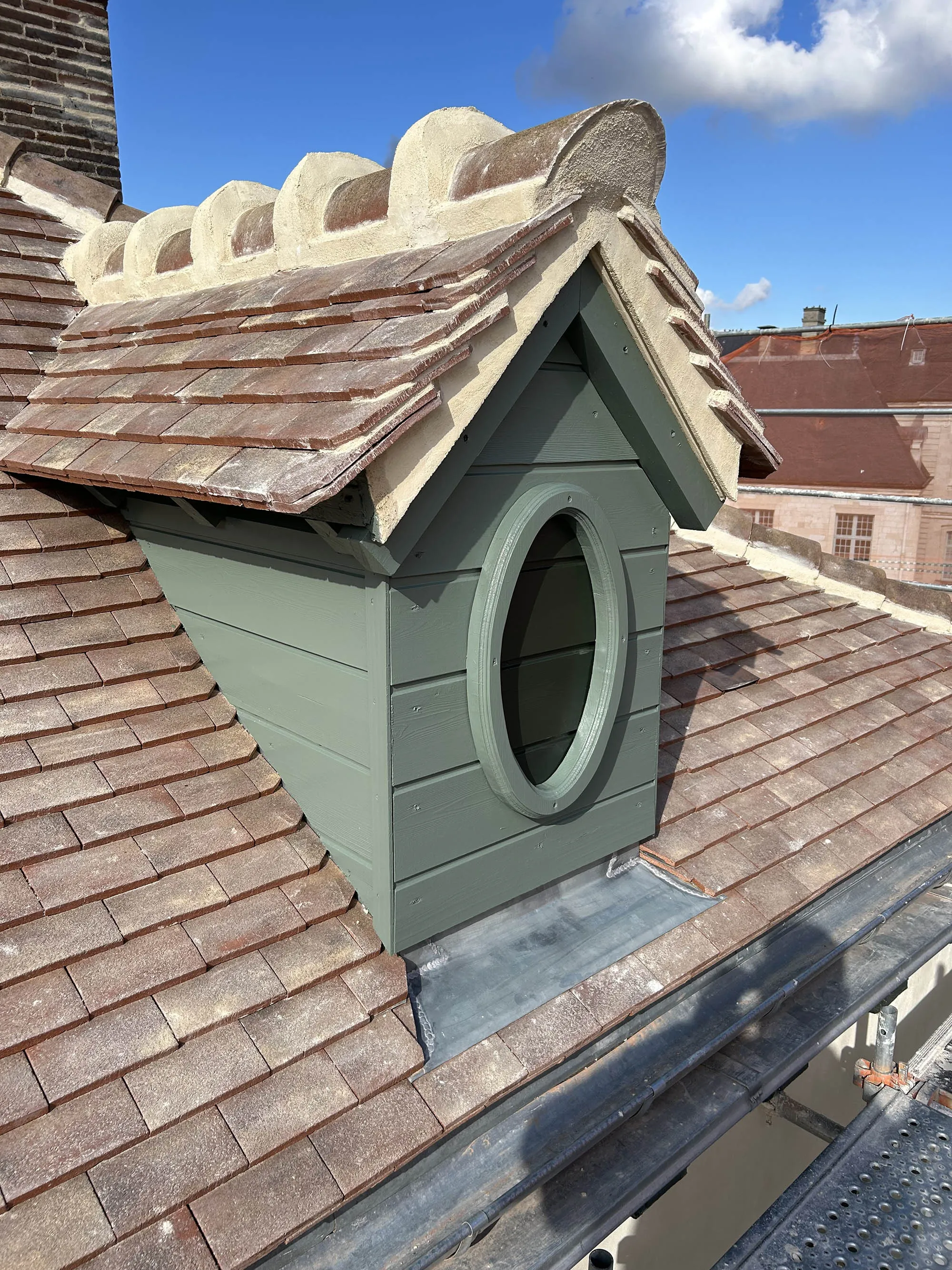 Ravalement de façade : nettoyage, mise en peinture du bardage, remise en peinture de certains murs et traitement des éléments métalliques et des boiseries présents sur l’ouvrage.