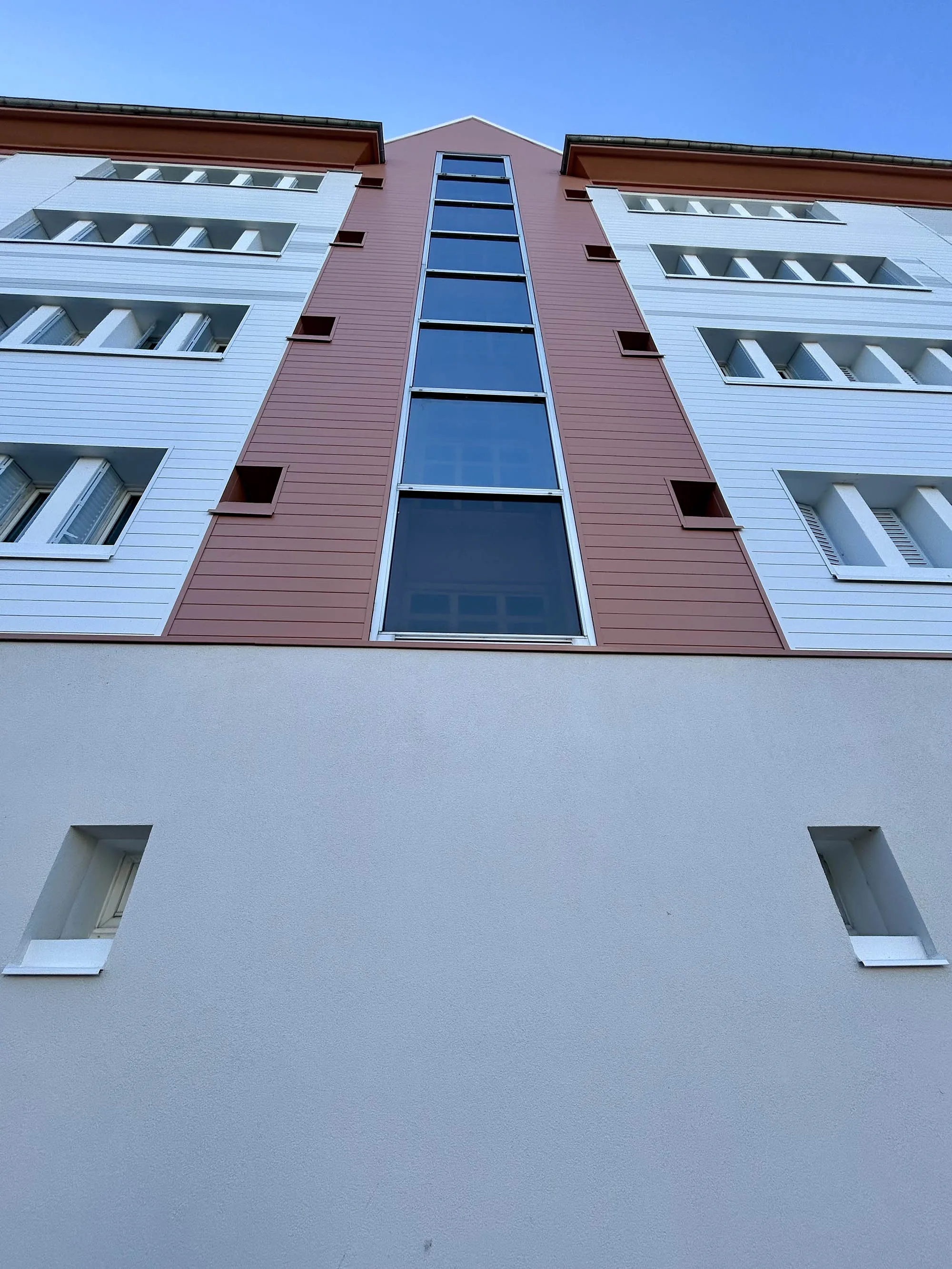 Ravalement de façade : nettoyage, réfection du bardage, remise en peinture des murs et traitement des éléments métalliques. Dégraissage et mise en peinture de l’ensemble des persiennes. Pose d’Isolation Thermique par l’Extérieur par panneaux PSE et finition enduit mince en rez-de-chaussée.